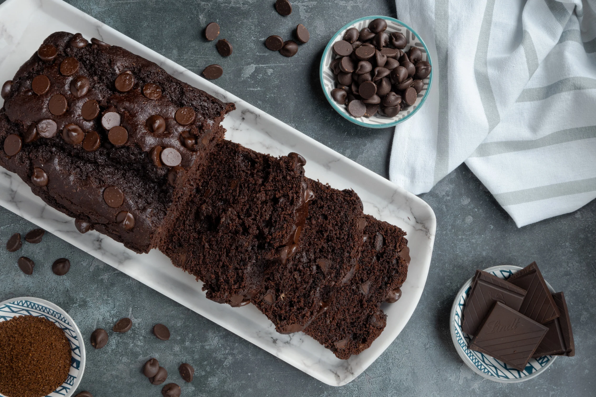Pour the mix into your prepared loaf tin, top with the remaining chocolate chips and bake it in a 160degC fan oven for 30 to 40 mins, or until a toothpick, when inserted, comes out clean. If you notice the top rising and cracking turn down the oven to 150degC and cover gently with tin foil until it is fully cooked through, be sure not to over bake. Once baked, leave your cake to cool in the tin for 10 mins, then remove it to a wire rack to cool completely. You can bake the loaf a day or two in advance and store it in an air tight container.