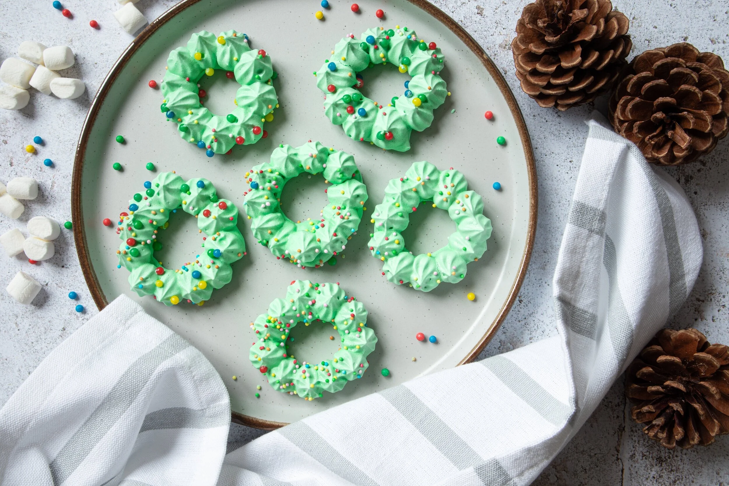 Everyone loves a deal right? So rejoice in this weeks 2 for 1 recipe! Both these adorably festive wreaths and the Peppermint kisses can be made from the same batch of meringue! Just simply half the mixture before colouring half green and you’re good to go!